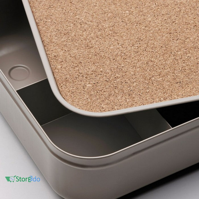 - Durable metal box with a cork lid on top that makes it easy to stack several boxes on top of each other, without scratching them, to keep everything in one place.